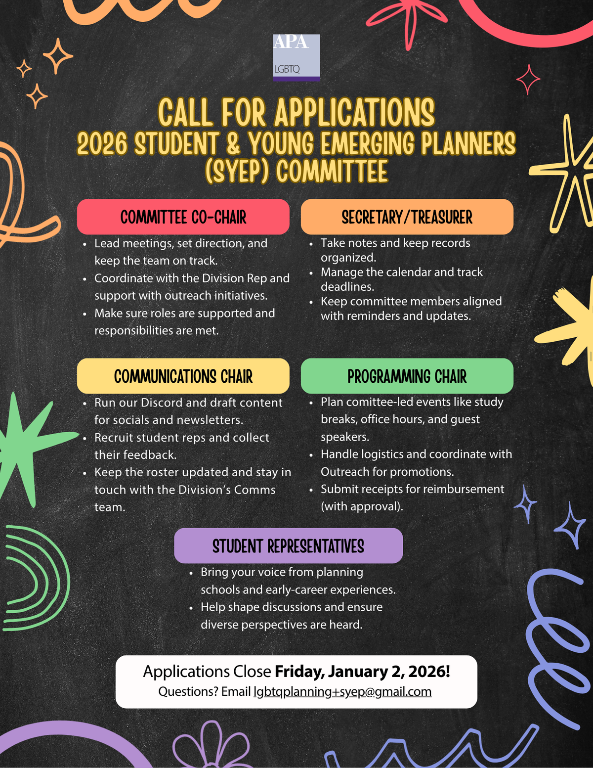 The Student and Young Emerging Planners (SYEP) Committee of the APA LGBTQ and Planning Division is led by Students and Young Emerging Planners committed to uplifting queer and trans planning students and early-career professionals. SYEP exist to foster connection, visibility, and leadership opportunities for LGBTQIA+ individuals navigating the field of planning.